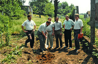 Spatenstich Bauhof Rothenberg 1988 (von links): Architekt Willi Albert, Bürgermeister Willi Menges, Gremienmitglieder Hermann Krieger, Heinrich Beisel, Hans Schwinn und Burkhard Bartmann