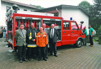 Übergabe Löschfahrzeug an FF Finkenbach 1998 (von links): Erster Beigeordneter Karlheinz Werner, Wehrführer Rüdiger Seip, stellvertr. Wehrführer Günther Oes, Bürgermeister Willi Menges und Gemeindevertreter Manfred Wehner