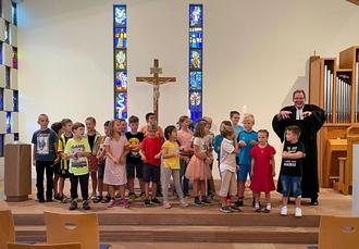 Um kurz vor halb 11 läuteten die Kirchenglocken – das Zeichen, dass Pfarrer Frohmuth uns erwartet. Alle zusammen liefen wir zur Kirche, wo uns unser lieber Pfarrer Frohmuth gut gelaunt erwartete. Es wurde viel gesungen und der Pfarrer erinnerte uns daran, dass wir alle verschieden und gleichzeitig alle wunderbar sind. Genauso, wie wir sind. Er sprach davon, dass sowohl das Dorf Gammelsbach, aber auch die Schulgemeinde nur bestehen kann, wenn man zusammenhält, wenn man sich wertschätz und Andere und deren Ansichten so akzeptiert. Mit einem Segen liefen wir gut gelaunt zurück zur Schule wo der Schultag auch schon endete.