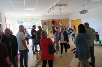 Zum Ende des alten Kindergartenjahres am 29.07.2023 wurde die neu gebaute Kita in der Gammelsbacher Straße in Betrieb genommen. Trotz des schlechten Wetters waren viele Kinder mit ihren Eltern, Mitglieder der städtischen Gremien, Kooperationspartner der Kindertagesstätt und Interessierte gekommen, um die schönen Räumlichkeiten des modernen und funktionellen Neubaus zu bestaunen.