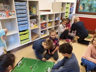 Nachdem es an der RvGS jahrelang eine Betreuung gab, wechselten wir im vergangenen Jahr in den Ganztag (GTA). Mit Einrichtung des GTAs gibt es auch das Angebot eines warmen Mittagessens, das sehr gut angenommen wird. Beliefert werden wir vom Gaucho in Beerfelden. Die meisten Schüler:innen kennen das bereits aus dem Kindergarten. Der Raum, in dem die Betreuung stattfand war ursprünglich unser Kunstraum. Mit der Betreuung und vor allem seit letztem Jahr, mit dem Start des GTA wurde der Raum hauptsächlich für das Mittagessen und das offene Lern- und Spielangebot, aber auch für AGs genutzt. Deshalb war es unumgänglich den Raum neu zu denken und auch neu einzurichten. Der Raum wurde in den Ferien vom Kreis frisch gestrichen. Geliefert wurden die Möbel in der ersten Schulwoche: Große Schränke in denen Bastelmaterial und Spiele verstaut werden können und rollbare verschieden hohe Regalsysteme mit Schubladen und magnetischer Rückseite. Je nachdem wie der Raum genutzt werden soll, können diese rollbaren Regale versetzt werden. Gemalte Bilder oder selbst gestaltete Plakate können an der Rückseite zum Bestaunen angebracht werden. Die Spielsachen in den Schubladen sind von den Kindern selbst einfach zu entnehmen und wieder ein zusetzen. Nun freuen wir uns sogar auf Regentage, in denen wir drinnen spielen werden. Wir freuen uns sehr über unseren neuen GTA-Raum und fühlen uns darin sehr wohl.