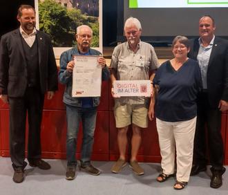 Brigitte Schanbacher, die Vorsitzende des Vereins Generationenhilfe Oberzent, erhielt unter Applaus die Urkunde zum "Digitallotsen Stützpunkt" des Landes Hessen. Die Urkunde übergaben ihr die Digitallotsen Wolfgang Jäger und Roland Just. Diese Anerkennung unterstreicht nicht nur den unermüdlichen Einsatz für die Förderung digitaler Kompetenzen in der Gemeinde, sondern zeigt auch die Wertschätzung und Anerkennung des Landes für das Engagement der Generationenhilfe.