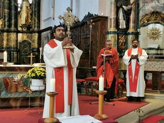 Um 10.00 Uhr begann der Festgottesdienst mit schönen Liedern, zu dem Pfarrer Pater Sijoy alle zahlreich erschienenen Gläubigen ganz herzlich begrüßte und seiner Freude darüber Ausdruck gab, dass auch seine Karmelbrüder Pater Joshy und Pater Alex gekommen waren. Er bat dann Pater Joshy als den Hauptzelebranten an diesem Festtag, der sich seit einem Jahr im Bistum Mainz als Priesterreferent um die Belange aller Priester kümmert, die Messfeier zu beginnen.
