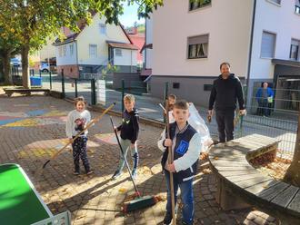 Damit das Fahren mit den Fahrgeräten und das Fußballspielen weiterhin Spaß macht, haben wir es uns zur Aufgabe gemacht, mittags im GTA immer mal wieder Laub zusammen zu fegen. Ausgestattet mit Besen und Rechen machen wir uns hochmotiviert an die Arbeit. Das aufgehäufte Laub sammeln wir in einem BigPack. Dieser wird dann vom Bautrupp abgeholt, wenn er voll ist. Gemeinsam etwas schaffen, zusammenarbeiten und sich absprechen sind eine gute Übung für das Miteinander. Ganz nebenbei wird die Beweglichkeit und die Motorik geschult. Nicht nur bei den Kindern - auch bei den helfenden Lehrern.