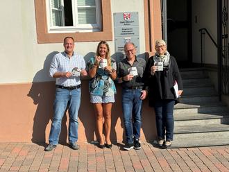 Als Zeichen der Anlaufstelle wurde der Aufkleber „Hilfesinsel“ sichtbar am Rathaus in Beerfelden angebracht. V.l.n.r.: Bürgermeister Christian, Kehrer, Svenja Beck, Werner Niebel, Diana Zimmermann.