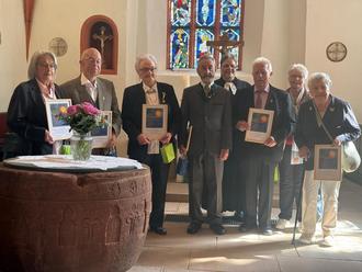 Das seltene Fest der Kronjuwelenkonfirmation konnten in der Quellkirche in Güttersbach feiern: Margarethe Nieratzky geb. Bechtold, Horst Ludwig Haas, Anni Eisenhauer geb. Schäfer, Willi Meister, Helmut Georg Müller mit Ehefrau und Elfriede Ihrig geb. Germann. 75 Jahre nach ihrer Konfirmation erhielten sie von Pfarrerin Xenia Mai den Segen Gottes.