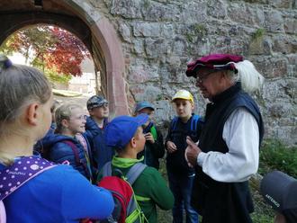 Nach einer gemütlichen Wanderung von Rothenberg aus mit ausgiebigem Picknick unterwegs, wurden wir, die Schülerinnen und Schüler der 4. Klasse der Grundschule Rothenberg, vor den Toren der früheren Burg Hirschhorn von Herrn Waibel, der sich uns als Ritter Friedrich vorstellte, herzlich in Empfang genommen.