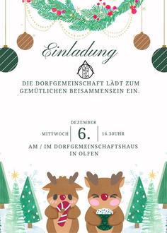 Die Dorfgemeinschaft Olfen lädt zum gemütlichen Beisammensein am Nikolaustag ein. Am Mittwoch, den 06.12.2023 gibt es ab 16.30 Uhr auf dem Platz vorm Dorfgemeinschaftshaus Olfen Glühwein, Punsch und für den kleinen Hunger Bockwürstchen und Crêpes. Um 17 Uhr kommt der Nikolaus zu uns und beschenkt die Kinder. Wir freuen uns auf viele bekannte und auch neue Gesichter von nah und fern und auf einen schönen Abend bei vielen Leckereien. Bei schlechtem Wetter findet die Veranstaltung im Dorfgemeinschaftshaus statt. Weitere Infos und die Anmeldung zum Nikolaus bis zum 22.11.2023 bei Selina Welb unter 06068 2557.