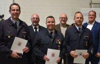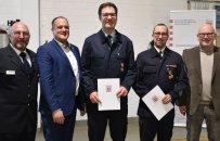 Landrat Matiaske und Kreisbrandinspektor Friedrich ehren Katastrophenschutz-Kräfte.