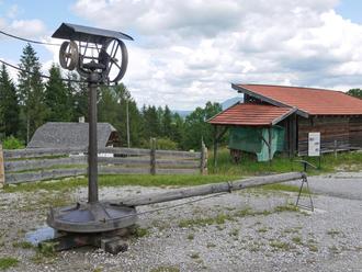 Ein noch funktionsfähiger Säulengöpel steht im Freilichtmuseum in Glentleiten. Mit einem solchen Göpelwerk wurde Wasser aus Bergwerken und Brunnen geschöpft.