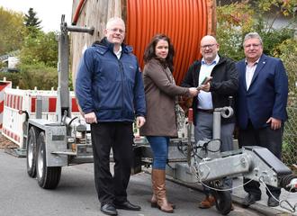 Es kann vorangehen: Landrat Frank Matiaske (zweiter von rechts), Breubergs Bürgermeisterin Deirdre Heckler, die auch der OGIG-Gesellschafterversammlung vorsitzt, sowie OGIG-Geschäftsführer Marius Schwabe (links) und OGIG-Prokurist Detlef Kuhn freuen sich über Gelder von Bund und Land, mit denen der öffentlich geförderte Gigabit-Ausbau im Jahr 2024 beginnen kann. Sie stehen an einer Netz-Baustelle in Höchst, wo ein Telekommunikationsunternehmen Glasfaserkabel bereits selbst verlegt.