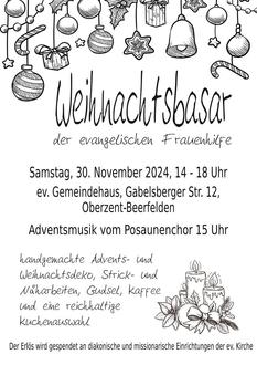 Die Mitglieder der Evangelischen Frauenhilfe gestalten auch in diesem Jahr am Samstag vor dem ersten Advent wieder ihren traditionellen Weihnachtsbasar mit vielen selbst hergestellten Dingen wie: