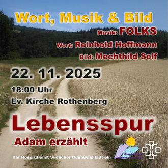 Am 22. November um 18:00 Uhr laden Sie die MusikerInnen von Folks, die Fotografin Mechthild Solf und Pfarrer Hoffmann ein, in der Evangelischen Kirche zu Rothenberg den Lebensspuren von Adam zu folgen. Musikalisch umrahmt wird der Abend von keltisch und irisch anmutender Musik.