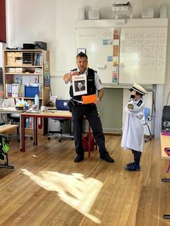Gehen wir aber erst einmal ein paar Minuten zurück. Die Kinder der Klasse 1/2 bekamen vor wenigen Minuten den Fußgänger-Führerschein. Es waren noch 20 Minuten Zeit bis zur Pause und Herr Kiermeier fragte die Kinder, ob sie ihm helfen können bei einer Fahndung. Herr Weinmann war völlig ahnungslos, das war nicht abgesprochen. Herr Kiermeier zog einen Zettel aus seiner Tasche mit den Worten FAHNDUNG. Auf dem Zettel war auch noch das Gesicht von Herrn Weinmann abgedruckt. Die Kinder erstarrten vor Schreck und wussten auch nicht so recht, ob dies nun Spaß war, oder ernst gemeint. Dazu noch die Anklageschrift auf rotem Papier! Langsam wurde den Kindern aber klar, dass dies nur ein Spaß war und Herr Kiermeier ein wenig Action in den Schulalltag bringen wollte. Und dies gelang ihm auch! Natürlich ist ein einziger Polizist meist machtlos gegen schwerkriminelle Verbrecher. Zu einem solchen sollte Herr Weinmann zählen. Deshalb holte sich Herr Kiermeier Verstärkung: Ein Hilfspolizist und zwei Kripo-Beamte halfen ihm dabei, Herrn Weinmann zu verhaften. Da saß er nun mitten im Klassenzimmer, mit Handschellen und lachenden Kindern um sich herum. Bis zur Gerichtsverhandlung. Sein Anwalt/Verteidiger hat leider seinen Part nicht ganz verstanden und brüllte ganz laut: „Du kommst in de’ Knast!“ Dem war zum Glück nicht so. Das Gericht entschied, nachdem es sich zur Beratung zurückgezogen hatte: „Im Namen der Schüler:innen ergeht folgendes Urteil: „Lehrer Weinmann kann auf freien Fuß gesetzt werden. Auflage: Er muss bei passender Gelegenheit jedem Schüler der 1. u. 2. Klasse der RvGS ein Waffeleis mit mindestens einer Kugel ausgeben. Lehrer Weinmann, nehmen Sie das Urteil an?“