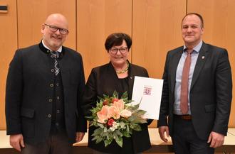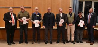 Großes Engagement: Über den Landesehrenbrief freuen sich (von links) Horst Heyl, Arno Kaczmarek, Bernd Pfeifer und Ellen Koch. Überreicht wurde die Ehrung von Landrat Frank Matiaske (Mitte). Zu den Gratulanten gehören auch die Bürgermeister Horst Bitsch (links), Dr. Tobias Robischon (dritter von rechts) und Christian Kehrer.