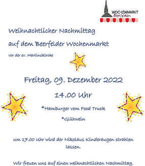 Am Freitag, 09. Dezember 2022 wird wieder ein weihnachtlicher Nachmittag auf unserem Wochenmarkt (vor der ev. Martinskirche) stattfinden. Wer Interesse hat, sich mit kreativen Basteleien wie Weihnachtskarten, Windlichter oder Handarbeiten zu präsentieren meldet sich bitte bis spätestens 06. Dezember bei Regina Georg, Tel 06068-7590-920 oder unter tourismus@stadt-oberzent.de.