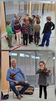 Zum Abschluss des Themas „Instrumentenkunde“ erwartete die Kinder der Klasse 2 ein besonderes Highlight. Nachdem sie in den letzten Wochen ganz verschiedene Instrumente kennengelernt, gehört und ausprobiert haben, waren Sie nun gespannt ein Instrument direkt von einem Berufsmusiker erklärt zu bekommen. Gemeinsam mit Arne Müller, Konzertmeister und Leiter der Kurpfalzphilharmonie Heidelberg, haben sie sich die Violine genauer angeschaut. Die Kinder lauschten der Geigenmusik zu Beginn sehr aufmerksam. Direkt danach wurde auch schon gemeinsam dazu gesungen und der Aufbau einer Violine besprochen. Währenddessen konnten die Kinder all ihre Fragen stellen und die eingebauten Rhythmusübungen hielt die Aufmerksamkeit hoch, bevor abschließend das eigene Ausprobieren der Geige auf dem Plan stand, auf das sich alle schon seit Beginn der Stunde freuten. Jedes Kind durfte sich selbst an der Geige ausprobieren und mit etwas Unterstützung präsentierten die Kinder stolz ihre ersten eigenen Lieder auf der Violine. Auch das mitgebrachte Quiz motivierte die Kinder, ihr gelerntes Wissen am Ende der Stunde zu überprüfen. Alle Kinder gingen stolz und mit vielen neuen Eindrücken an diesem Tag nach Hause. Noch in der Frühstückspause klang das Lied „Liebe Mama hör´ mal an, was ich auf der Geige kann.“