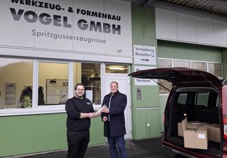 Geschäftsführer Tobias Vogel (links) übergab die Becher an Bürgermeister Kehrer (rechts)