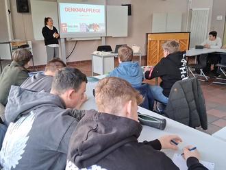 Am 12.11.2025 hörten wir einen Vortrag zum Thema Denkmalpflege. Zu Gast war Frau Carolin Schön, die mit der Firma Peter Walz Natursteine GmbH im Bereich Denkmalpflege tätig ist. Zu Beginn erzählte sie uns von ihrem persönlichen Werdegang. So berichtete sie, dass sie während der Schulzeit ein Auslandsjahr in den USA verbracht hat, genauer in Florida. Anschließend absolvierte sie eine Ausbildung bei der Sparkasse. Danach arbeitete sie ein Jahr lang als Quereinsteigerin im Jobcenter. Später übernahm ihr Vater die Firma Peter Walz Natursteine GmbH. Gemeinsam spezialisierten sie die Firma auf Denkmalpflege. Frau Schön erklärte uns, dass es in diesem Beruf vor allem darum geht, historische Bauwerke so zu restaurieren, dass man die Eingriffe nicht erkennt. Ziel sei es, dass die Gebäude nicht wie neu aussehen, sondern, dass die Geschichte des Bauwerks erhalten bleibt und die kulturelle Bedeutung geschützt wird.