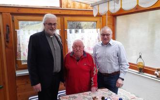 Unser Foto zeigt (v.l.n.r.): Pfarrer Reinhold Hoffmann, der ebenfalls zu Besuch war, mit dem Jubilar Wilfried Wieder und Stadtrat Karlheinz Braun