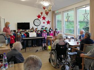 Wie bereits im letzten Jahr, besuchten die Religionskinder der Klassen 1 und 2 die Bewohner des Seniorenzentrums Haus Cordula in Rothenberg, um jedem von ihnen einen kleinen selbstgebastelten Weihnachtsengel zum Aufstellen zu bringen. Ganze 100 Stück bastelten die Kinder in unermüdlichem Fleiß, denn, da waren sich alle einig, keiner sollte leer ausgehen! Das Besondere in diesem Jahr war aber, dass wir wieder singen durften und so sangen wir einige Lieder, präsentierten ein vertontes Sprechstück und musizierten mit Instrumenten. Sowohl den Kindern, als auch den Bewohnern war die Freude deutlich anzusehen. Abschließend bekamen alle noch Kakao, Saft und Süßigkeiten. Vielen herzlichen Dank den Mitarbeiterinnen des Seniorenheims!