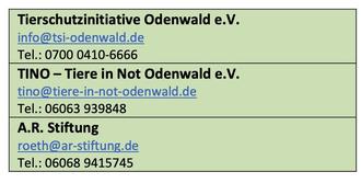 Melden Sie sich beim Ordnungsamt der Stadt Oberzent (E-Mail: ordnungsamt@stadt-oberzent.de oder Tel.: 06068 7590-970) oder bei einem der Tierschutzvereine unserer Region, wenn Sie Unterstützung benötigen oder in Ihrer Nachbarschaft eine Überpopulation bekannt ist.