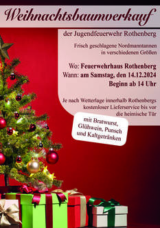 Traditionell lädt die Jugendfeuerwehr Rothenberg, auch dieses Jahr, am 14.12.2024 zu ihrem Weihnachtsbaumverkauf ein.