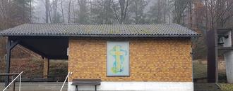 Das Fenster aus Glasbausteinen in der Airlenbacher Trauerhalle musste aus Altersgründen ersetzt werden. Es zeigte ein blaues Kreuz in hellem Glas. Im Zuge der Erneuerung wurde ein normales Fenster eingebaut. Um das alte Kreuz aus Glasbausteinen aufzugreifen und dem Raum die nötige Würde zu verleihen, wurde das Fenster mit einer Motivfolie beklebt. Der Ortsbeirat bedankt sich bei Andrea Drerup für die Gestaltung des Motivs und bei der Stadt Oberzent für die Kooperation.