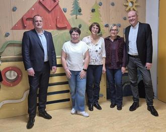 Verabschiedung einer verdienten Mitarbeiterin (v.l.n.r.): Bürgermeister Christian Kehrer, die stellvertretende Kita-Leiterin Daniela Kessler-Daub, die künftige Ruheständlerin Elke Krause sowie Kollegin und Personalratsmitglied Birgit Schäffler. Auf dem Foto abgebildet ist ebenso Kim Reipöhler, der künftig die Funktion der Kita-Leitung innehat.