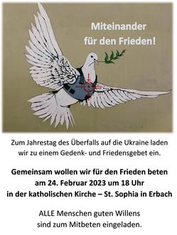 Gemeinsam wollen wir für den Frieden am 24. Februar 2023 um 18 Uhr in der katholischen Kirche in St. Sophia in Erbach,Hauptstraße 28 beten.