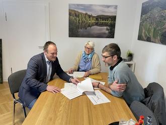 Bürgermeister Christian Kehrer (links im Bild) , Benjamin Renkel-Magsam (rechts) von der Ehrenamtsagentur des Odenwaldkreises und Diana Zimmermann (Mitte) vom Fachdienst Generationen und Soziales der Stadt Oberzent bei einer Arbeitssitzung zum Engagement -Lotsen Programm