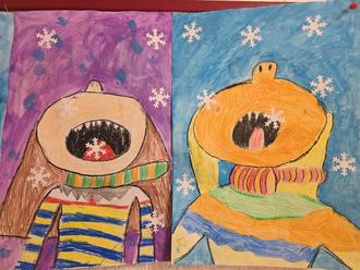 Den Schneefall im Dezember und Januar haben wir zum Anlass genommen, um uns auch im Kunstunterricht mit diesem Thema zu befassen. So haben wir uns selbst gemalt, während wir versuchen Schneeflocken mit der Zunge aufzufangen. Lustig-schöne und vor allem bunte Bilder sind entstanden, die uns gute Laune in den Schulflur bringen.
