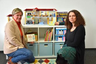 Ein offenes Ohr für Kinder: Sandra Veigl (links), die Leiterin der Beratungsstelle für Kinder, Jugendliche und Eltern, mit ihrer Kollegin Gesa Heimann. In einem eigenen Zimmer finden Kinder viele Möglichkeiten, um mitzuteilen, was sie bewegt. Zum Beispiel können sie das, was sie in der Schule erleben, in einem Haus nachstellen. Auch Spiele, Bücher und Bildkarten können helfen, miteinander ins Gespräch zu kommen.