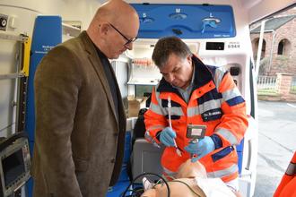 Modern ausgestattet: Dr. Bernhard Krakowka erläutert Landrat Frank Matiaske in einem Rettungswagen an einer Puppe eine Video-Laryngoskopie. Die Kamera bietet eine Sicht auf den Kehlkopf und die Stimmbänder, so dass der Einsatz eines Beatmungstubus‘ in die Luftröhre möglich wird.