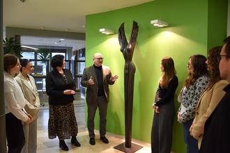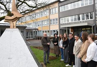 Symbol für Schutz: eine „Wächter“-Figur von Gabriele von Lutzau im Eingangsbereich des Landratsamts. Gemeinsam mit Ute Naas vom Kulturmanagement der Kreisverwaltung bringt Landrat Frank Matiaske das Werk einigen Auszubildenden näher. Symbol für Freiheit: die Pyramide des Perseus von Bernd Rosenheim vor dem Landratsamt. Landrat Frank Matiaske und Kulturmanagerin Ute Naas tauschen sich mit Auszubildenden über das Kunstwerk aus.