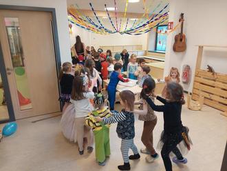 Nach einem gemeinsamen Auftakt auf dem „Marktplatz“, bei dem die Kinder stolz ihre fantasievollen Kostüme präsentierten und gemeinsam das Lied „Einmal um die Welt!“ sangen, startete die große Faschingsparty.