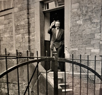 Lehrer Schüppel am Eingang des Güttersbacher Schulhauses.
