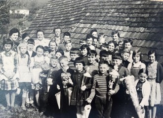 -Dezember 1961: Weihnachtszeit ging es hinaus in den Wald, um den Nikolaus zu suchen. Er kam mit Pferd und Wagen und in seiner Begleitung war das Christkind, dass für alle Schüler ein Päckchen dabeihatte. Kurz vor Weihnachten wurde das Märchenstück „die zertanzten Schuhe“ aufgeführt.