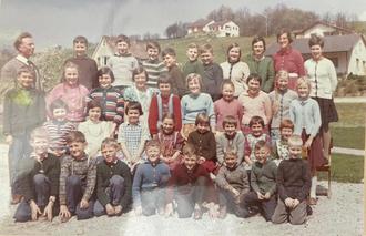 Die Schulkinder mit den fünf neu eingeschulten Schülern (vorne) 1963.