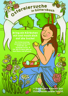 Drückt alle die Daumen, damit wir am Ostermontag gutes Wetter bekommen und der Osterhase wieder nach Güttersbach hoppelt, um viele Eier zu verstecken. Zwischen 10 Uhr und 12 Uhr könnt ihr rund um den Dalles auf die Suche gehen. Bringt also eure Körbchen mit! Für Groß und Klein gibt es Getränke und Brezeln.