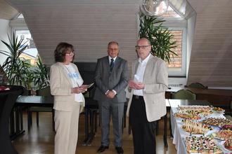 Auch der Vorsitzende der Gemeindevertretung, Reinhard Kübler, dankte ihr für den stets guten Kontakt und das freundschaftliche Miteinander. „Es hat mit immer Spaß gemacht“, äußerte der Erste Beigeordnete Harald Eisenhauer seine Freude über das gemeinsame Wirken und dankte im Namen des Gemeindevorstandes, bei dessen Sitzungen Naas die „Chefin des Protokolls“ war. Eisenhauer würdigte insbesondere ihre Unterstützung während der Erkrankung des damaligen Bürgermeisters Willi Keil, als sie über viele Monate hinweg entscheidende Aufgaben übernahm. „Ich wäre nie auf die Idee die Stelle zu wechseln“, äußerte am Ende auch die Neuruheständlerin selbst ihre Zufriedenheit mit der jahrzehntelangen Arbeit im Rathaus, in die mit der Zeit hineingewachsen sei. Mit herzlichen Glückwünschen für den neuen Lebensabschnitt verabschiedete sich Bareis am Ende von seiner geschätzten Mitarbeiterin und wünschte ihr nun viel Freude für die Zeit mit der Familie, zu der Ehemann Günter, die beiden Töchter sowie die Enkelkinder gehören, denen sie sich zukünftig noch intensiver widmen möchte. Bürgermeister und Kollegen überreichten am Ende Blumen und Geschenke und die Feier klang schließlich in geselliger Runde aus.