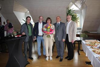 Die besten Wünsche für den Ruhestand von Ute Naas mit Ehemann Günter (zweiter von links) überbringen Gemeindevertretervorsteher Reinhard Kübler, Bürgermeister Dietmar Bareis und Erster Beigeordneter Harald Eisenhauer.