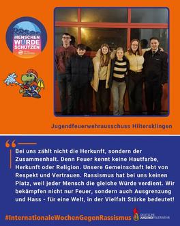Anlässlich der Internationalen Wochen gegen Rassismus setzt die Jugendfeuerwehr Hiltersklingen ein klares Zeichen: Die Würde jedes Menschen ist unantastbar. Sie zu schützen ist unsere Aufgabe - im Feuerwehrdienst und in der Gesellschaft. Vielfalt ist keine Schwäche, sondern unsere größte Stärke.