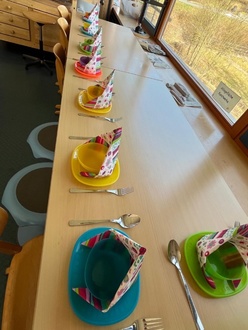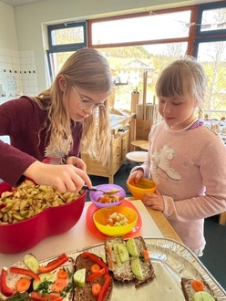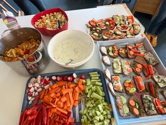 Und so bereiten die Großen innerhalb einer Schulstunde gemeinsam mit Frau Appel, Frau Beschnar und Frau Baumann eine Festtafel aus lauter Leckereien vor. Zudem wurden die Tische zauberhaft eingedeckt und die Gäste persönlich im Klassensaal Hand in Hand zum Festmahl geführt. Nach einer kurzen Begrüßung und Einführung wurde das Buffet eröffnet. Die Fachjury, die Kinder der 1b, ließen sich die Brotgesichter, den Nudel- und Obstsalat sowie die Gemüsesticks mit dem selbstgemachten Kräuterquark schmecken und bedankten sich recht herzlich. Natürlich durften die Großen ihr zubereitetes Essen ebenfalls verköstigen.
