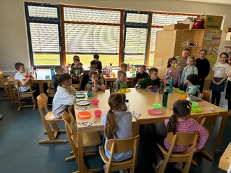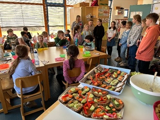 Nach langem Warten stand nun endlich die große Prüfung an: Die Klasse 4 hatte sich gemeinsam mit Frau Beschnar in den vorherigen Wochen im Rahmen des Ernährungsführerscheins, eines Programms des Bundeszentrums für Ernährung, intensiv mit den wichtigen Bestandteilen einer gesunden Mahlzeit beschäftigt. Gemeinsam wurde gelernt, wie verschiedene Gerichte, u.a. Kräuterquark, Brotgesichter, Obst- oder auch Nudelsalat, zubereitet werden können. Dazu konnten teils Produkte aus eigenem Anbau verwendet werden. Die Kinder lernten die Verwendung etlicher Küchengeräte als auch den sicheren Umgang mit diesen kennen. Nach bereits erfolgreich abgelegter Theorieprüfung durften die Kinder der Klasse 4 nun am Donnerstag, den 20.03. ihr Können unter Beweis stellen: Per Los entschied sich, welches Gericht in der Gruppe zubereitet werden sollte. Mit Rezeptvorlage und sonst kaum Hilfestellungen bereiteten die Kinder die zuvor erlernten Köstlichkeiten für die Klasse 1b vor. Diese Essenseinladung galt zudem als besonderer Dank für die vorherige Einladung der 1b zum Kaffeeklatsch im Dezember des letzten Jahres.