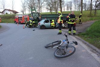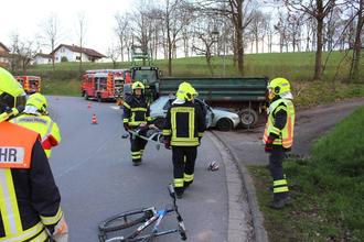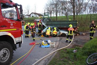 Was war geschehen: Der Fahrer eines Traktors mit Anhänger hatte beim Abbiegen aus einem Feldweg auf die Kreisstraße in einer unübersichtlichen Kurve zwei Radfahrer übersehen. Diese stürzten daher und gerieten unter den Anhänger, einer der beiden sogar unter die Reifen des Gespanns. Dazu kam, dass ein Autofahrer im schwer einzusehenden Kurvenbereich ebenfalls zu spät reagierte, in den bereits entstandenen Unfall raste und ebenfalls eingeklemmt wurde. Die Wehrleute um Einsatzleiter Dominik Hofmann bekamen es zudem mit einem aufgebrachten Traktorfahrer sowie einem vor Schmerzen schreienden Insassen des PKW zu tun und waren entsprechend gefordert. So mussten sie neben der technischen Rettung mit hydraulischem Gerät in zwei Abschnitten auch den Verkehr regeln sowie in der einsetzenden Dämmerung für ausreichendes Licht sorgen. Dazu ordneten sie auf einer Bereitstellungsplane das notwendige Material und die Gerätschaften an, um schnell darauf zugreifen zu können, um den Personenwagen vor dem Aufschneiden auch noch mit Rüstholzern zu sichern.