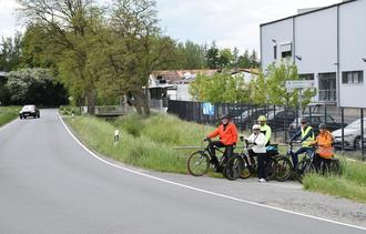 Gut aufpassen: An dieser Stelle in Brensbach kreuzt der Radfernweg R 9 die Landesstraße 3106. Auch die Gruppe mit den Nahmobilitätskoordinatoren des Odenwaldkreises, Markus Linkenheil und Thomas Schuhmacher (erster und zweiter von rechts), muss bei ihrer Radtour auf den Autoverkehr achten.