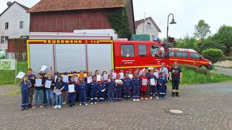 Die gesamte Gruppe mit Ihrer Leiterin Tamara Münch und der Fachbereichsleiterin der Kinderfeuerwehr Frau Jäckel