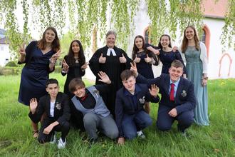 Am 7. Mai 2023 wurden in der Ev. Johanniterkirche zu Ober-Mossau folgende Jugendliche konfirmiert: Carlos Rivera, Jenny Scheve, Antony Eppler, Emily Rivera, Pfarrerin Xenia Mai, Jan Heck, Josephine Queste, Stella Queste, Tobias Krämer und Alexandra Merk.