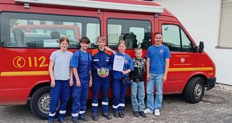 Gruppenfoto der Jugendfeuerwehr Hiltersklingen vor Ort in Billigheim